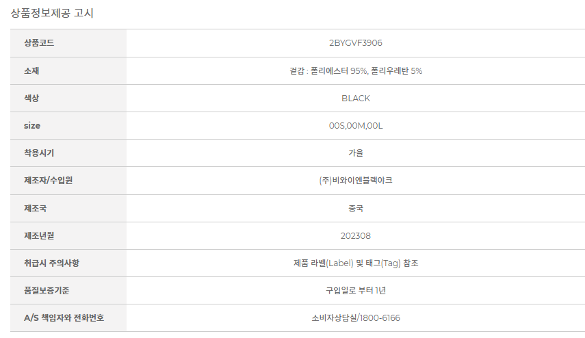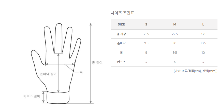 사이즈(손바닥 길이(cm) / 커스프 길이(cm) / 전체 길이(cm) / 손바닥 폭(cm) / 손목입고 폭(cm))