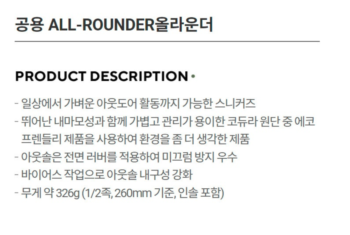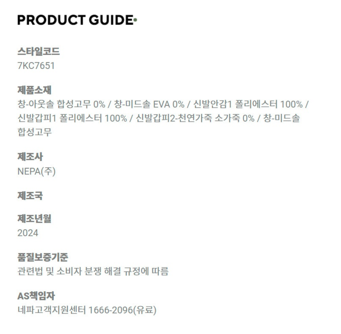 | 제품소재 | 신발갑피1 폴리에스터 100% 신발갑피2-천연가죽 소가죽 100% 신발안감1 폴리에스터 100% 창-미드솔 합성고무 창-미드솔 EVA 100% 창-아웃솔 합성고무 100% |