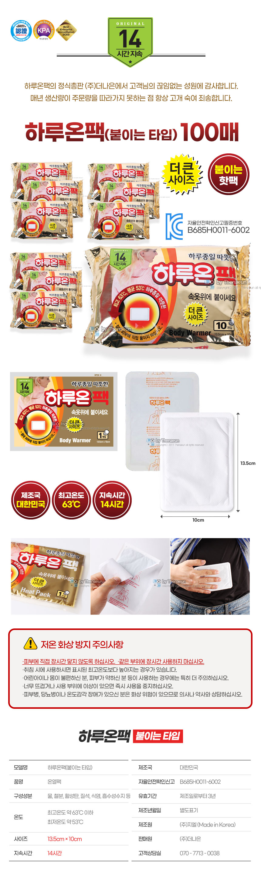 국내총판 붙이는 핫팩 하루온팩100매 / 2024년 이후 생산제품