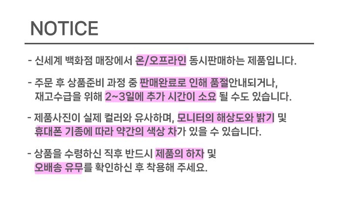 • 주문 후 상품 준비 과정 중 매장에서 판매가 완료되어 품절될 수 있습니다. 또한 발송이 지연되는 경우 상품이 확보된 다른 점포를 통해 배송이 될 수 있습니다.