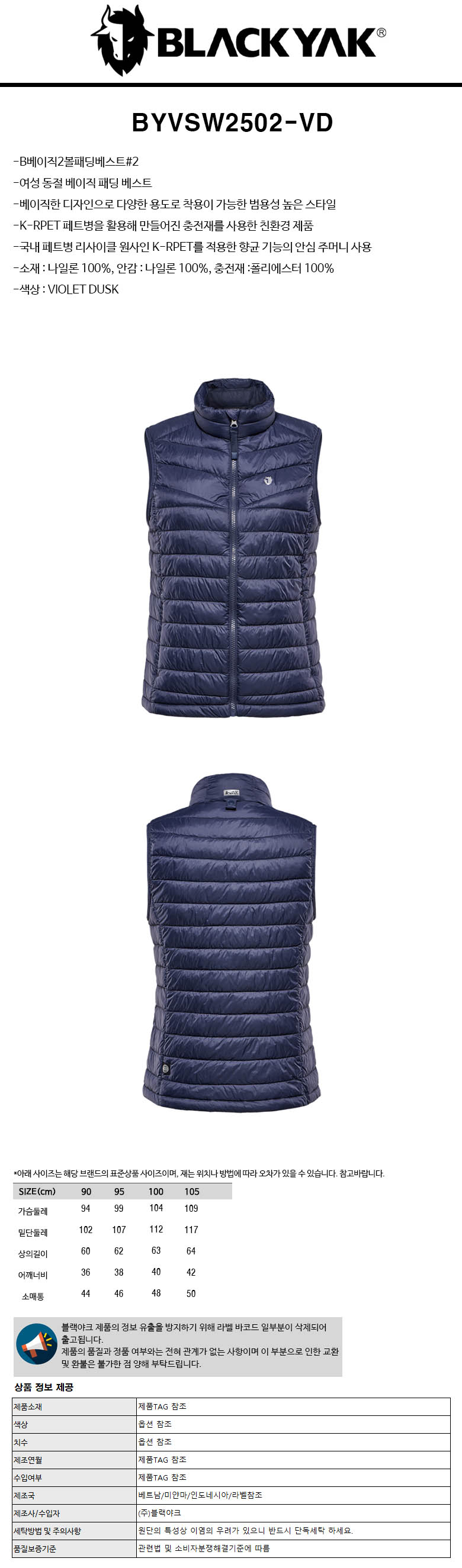 여성 B베이직2볼 패딩베스트2 R1BYVSW2502-VD