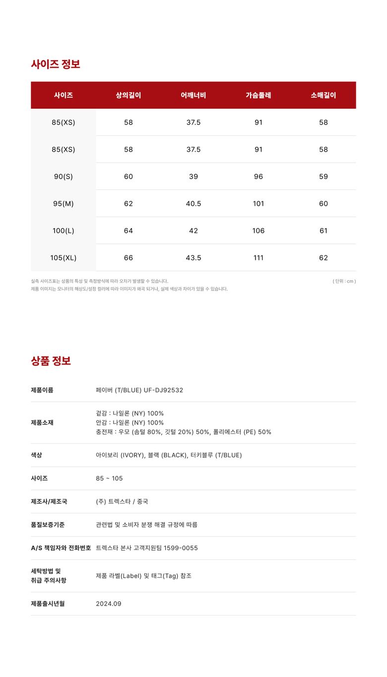 (롯데백화점)페이버 여성 구스 다운_T/블루_UF-DJ92532(사은품증정)