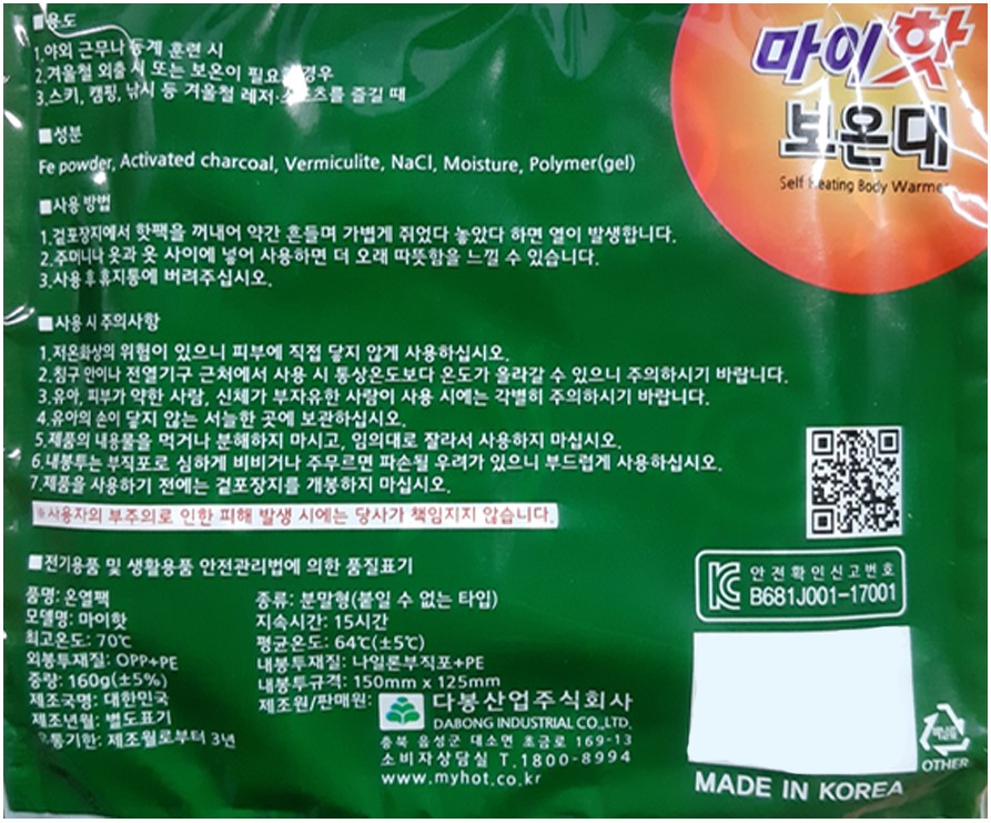 마이핫 보온대 핫팩 흔드는 손난로 160g x 100개E