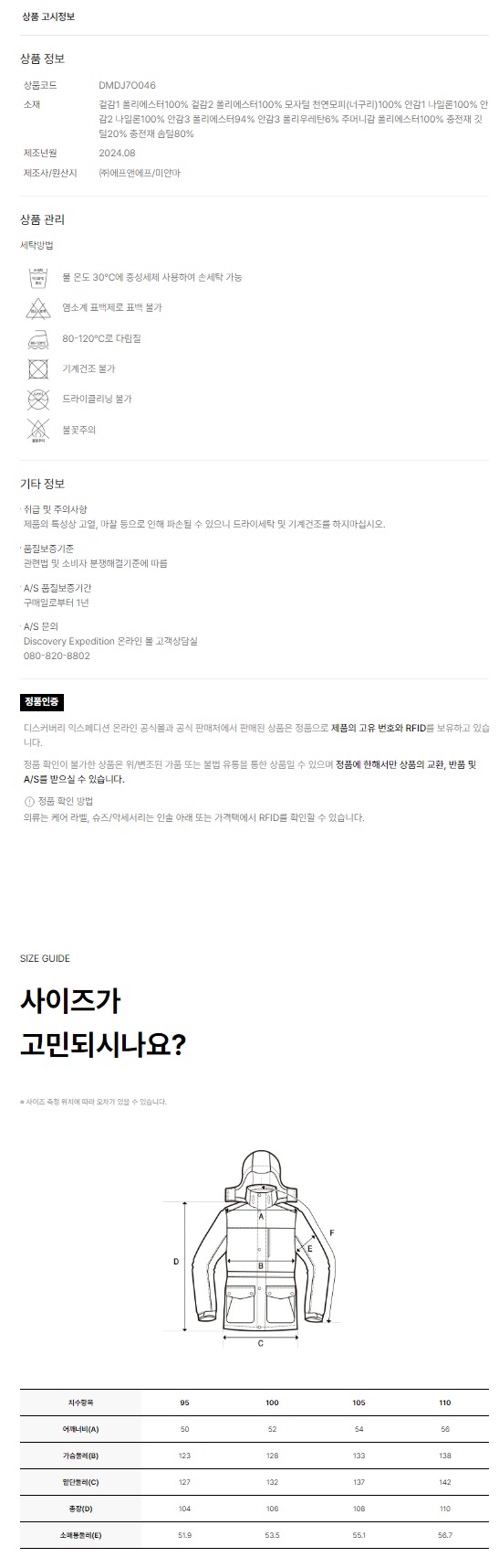 | A/S 책임자와 전화번호 | Discovery Expedition 온라인 몰 고객상담실//080-820-8802 |