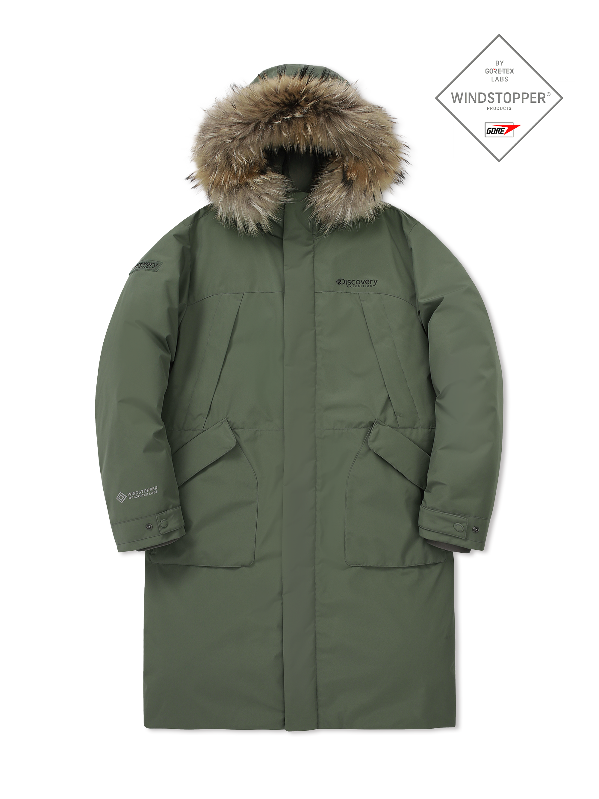 무릎까지 오는 롱기장 및 기능성 고어텍스 윈드스토퍼 소재를 적용하여 추운 겨울 보온성에 최적화된 롱패딩