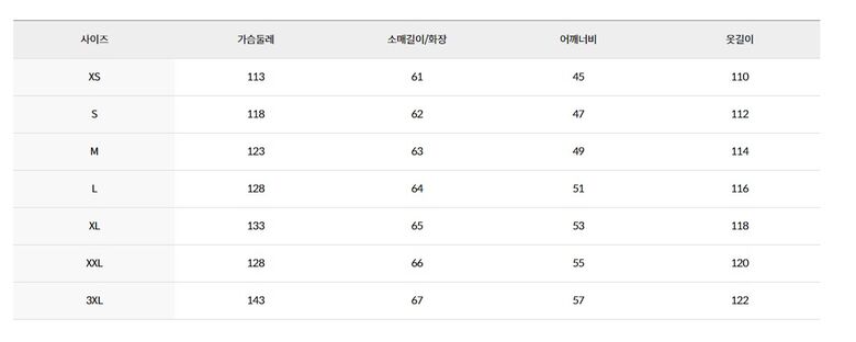 - 앞판 상단, 뒷판 상단, 소매 상단 : 다운 적용 (L 기준 210G)
