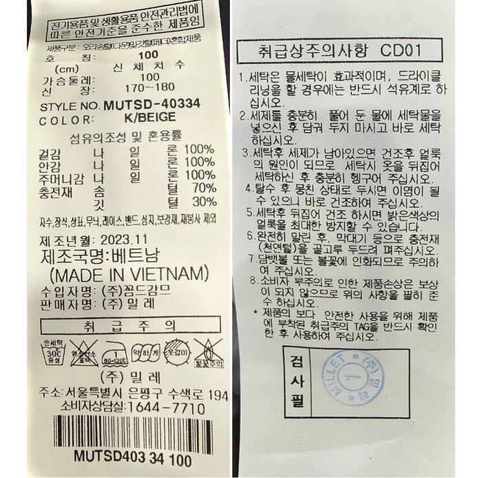 밀레 남성용 오리 경량 점퍼 MUTSD403 (S39115823)
