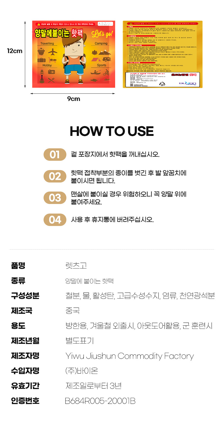 발바닥 핫팩 100매 발핫팩/안전인증/허리핫팩/군용