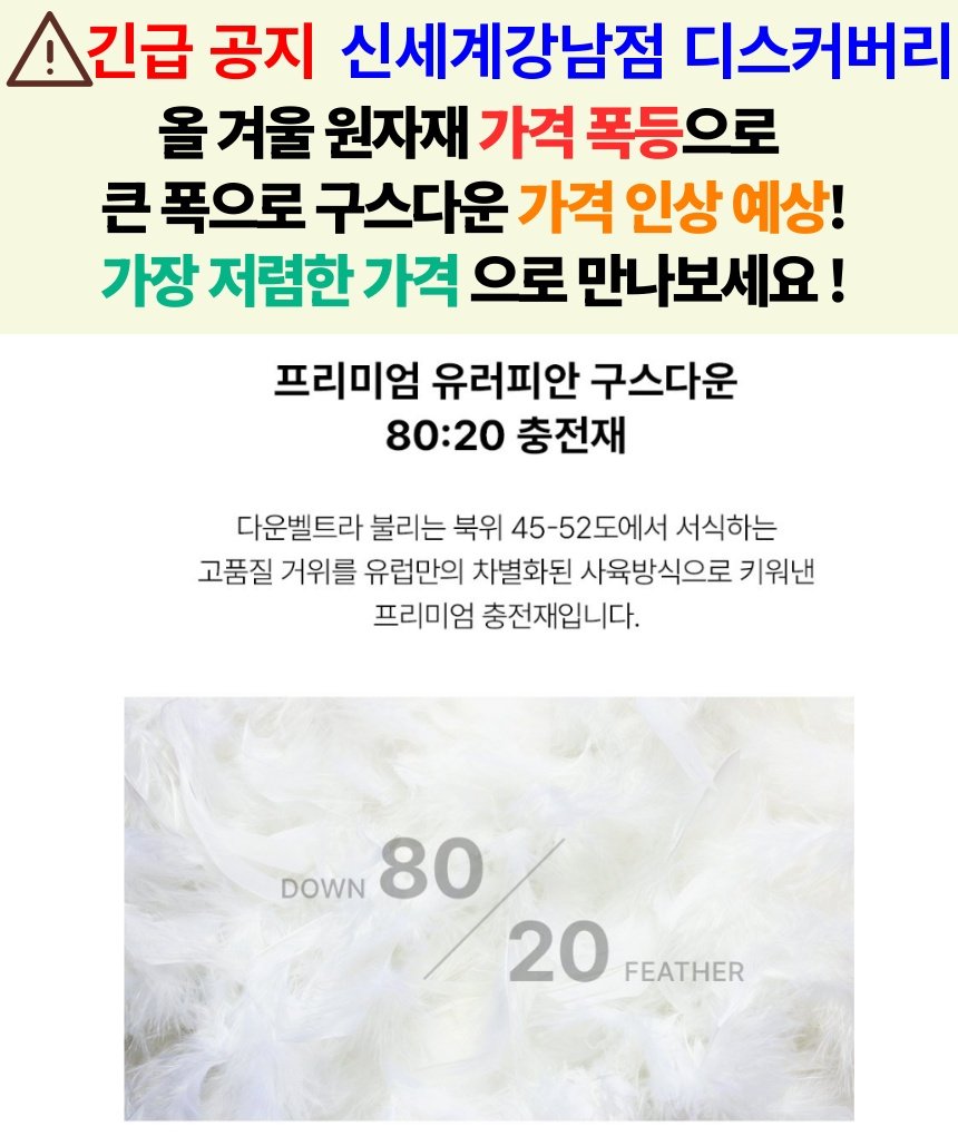 다운볼이 크고 필파워가 우수한 프리미엄 유러피안 구스다운 8020 충전재 사용으로 보온성과 강화