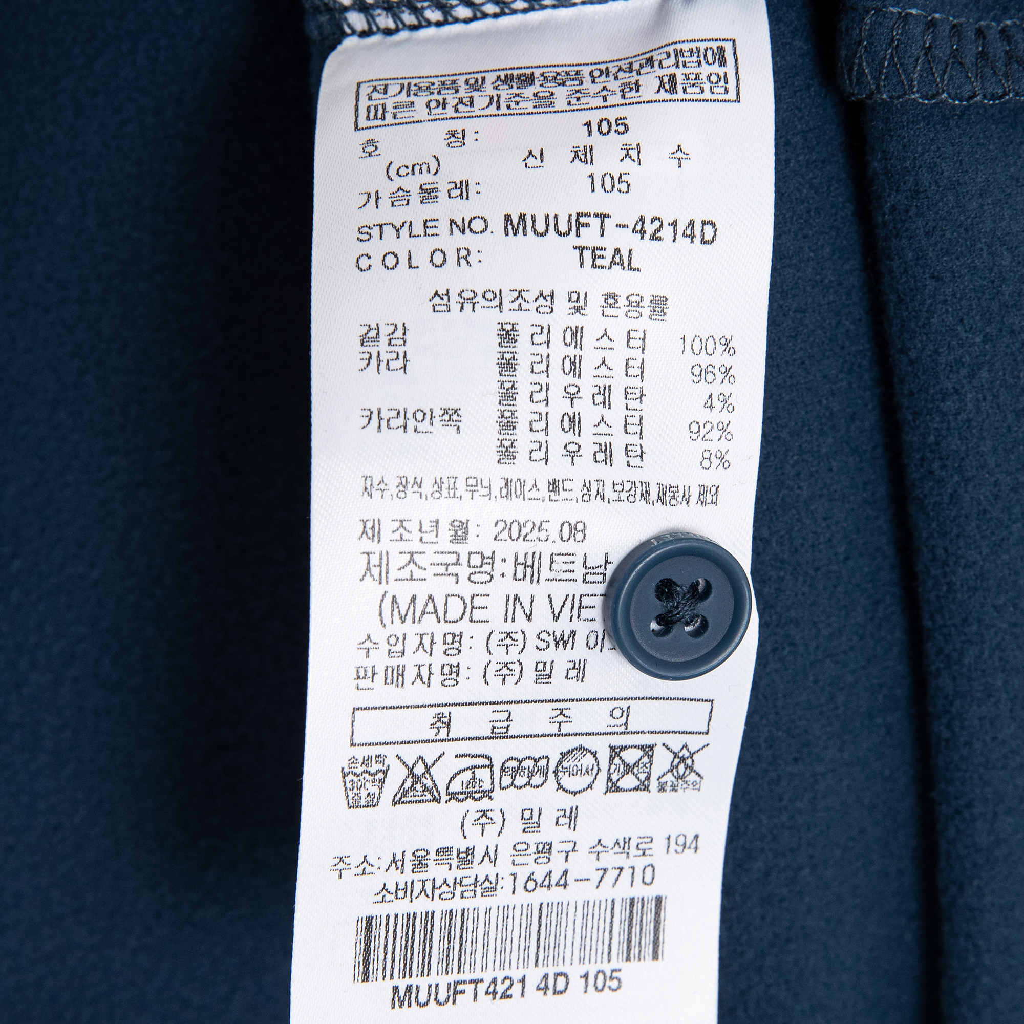 | 제품소재 | 겉감 폴리에스터 100% 카라 폴리에스터 96% 폴리우레탄 4% 카라안쪽 폴리에스터 92% 폴리우레탄 8% |