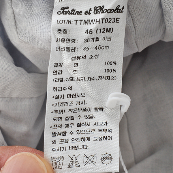 취급방법 및 취급시 주의사항, 안전표시 : 삶지 마십시오. 기계건조 금지. 주의! 작은 부품이 탈락되면 삼킬 수 있음.