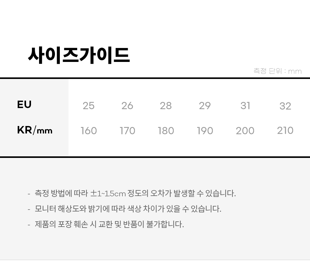 25(160mm), 26(170mm), 28(180mm), 29(190mm), 31(200mm), 32(210mm)