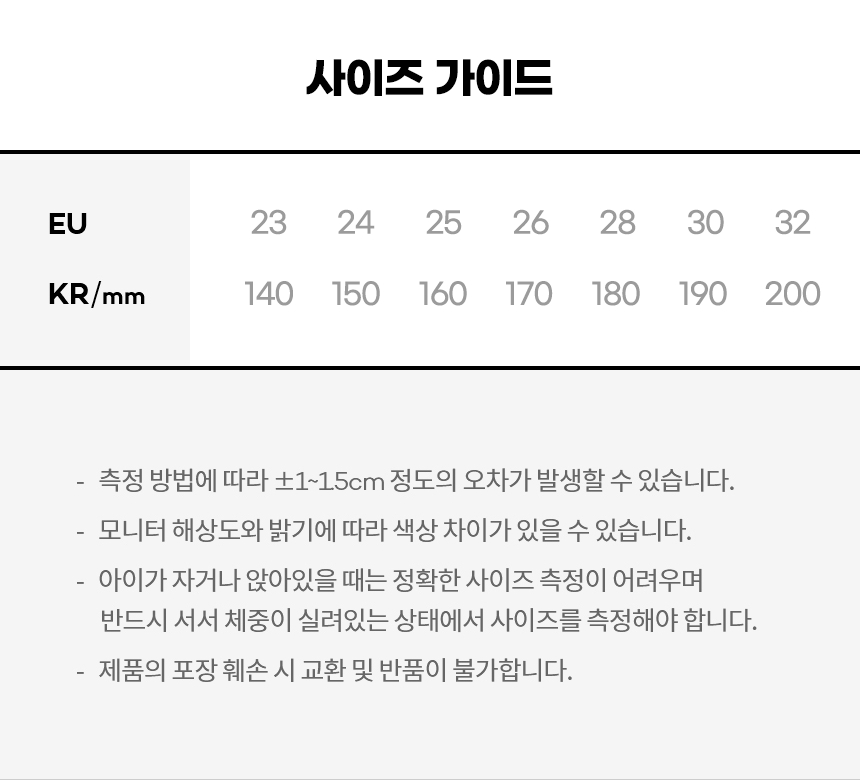 | 취급시 주의사항 | 1. 신고 걸을 때 꼭 스트랩을 부착해주세요. 2. 미끄럼 방지 기능은 수명과 관계 되어 오랜 시간 착화시 마모로 인해 그 기능이 저하 될 수 있습니다. 3. 표백 성분이 있는 세제,세탁기,탈수기는 사용하지 마십시오. 4. 에스컬레이터 탑승시 안전사고 예방을 위하여 안전선 안에 위치 하십시오. 5. 리본 장식과 금속 장식은 강한 충격을 주면 떨어지거나 파손될 수 있습니다. 6. 장시간 착용, 격한 활동은 소재 특성상 마모될 수 있습니다. |