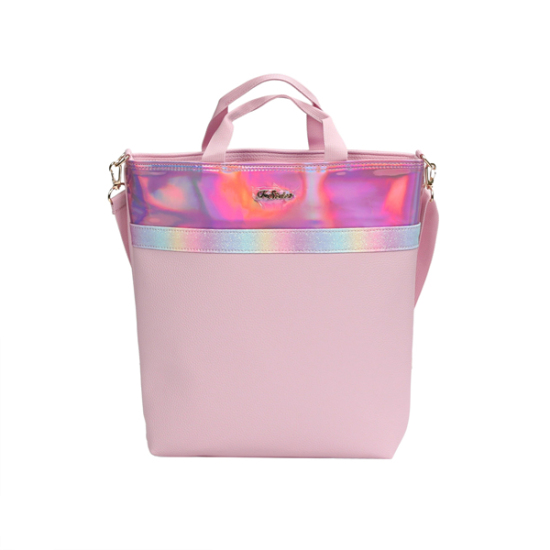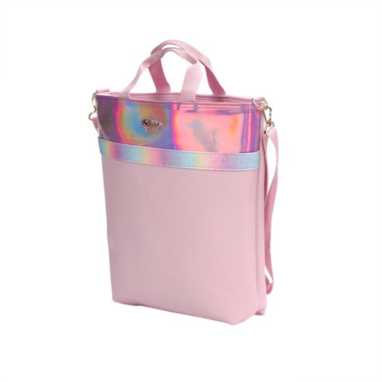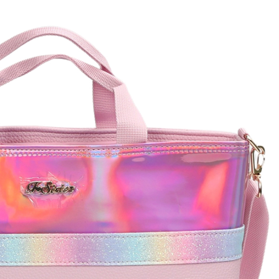 상세설명-핑크 칼라 소재와 책가방에 사용된 홀로그램, 펄 소재를 배색으로 주고 로고 장식으로 깔끔함을 살린 보조가방입니다.
