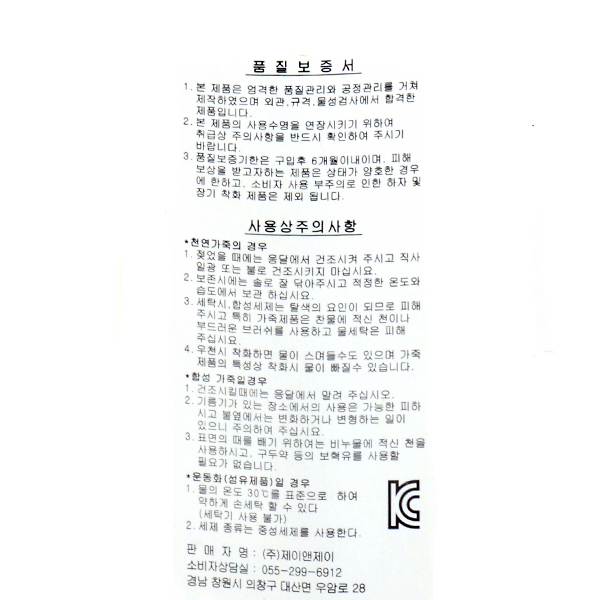 취급방법 및 취급시 주의사항, 안전표시 : 1.젖었을 때에는 통풍이 잘되는 응달에서 건조시켜 주십시요 2.오염시에는 비눗물에 적신 천이나 부드러운 브러쉬를 사용하십시요