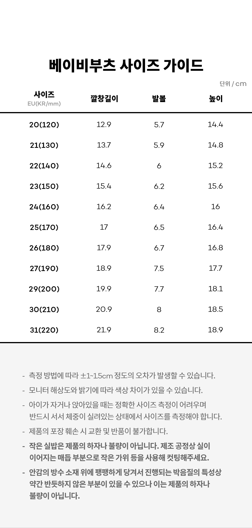 | 치수 | 21(130mm),22(140mm),23(150mm),24(160mm),25(170mm),26(180mm),27(190mm),29(200mm),30(210mm),31(220mm) / 3cm미만 |