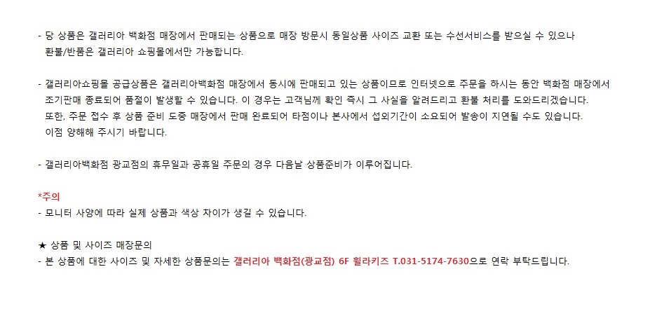 상품관련 상세문의처 : 갤러리아백화점(한화갤러리아㈜ 광교점) 휠라키즈_ T.031-5174-7630