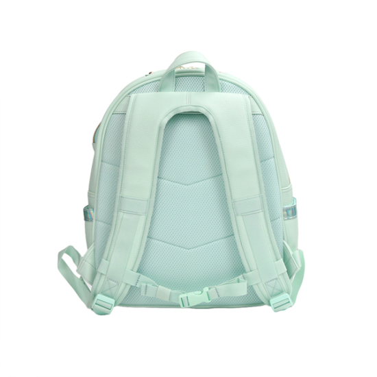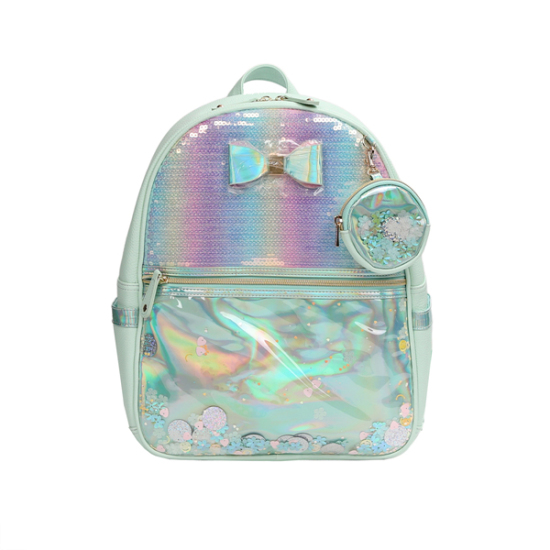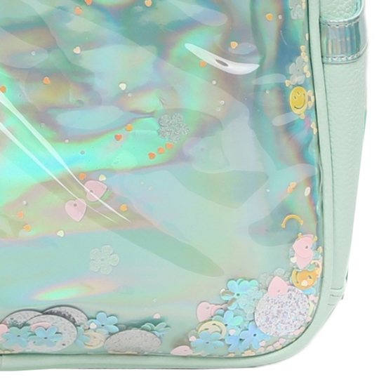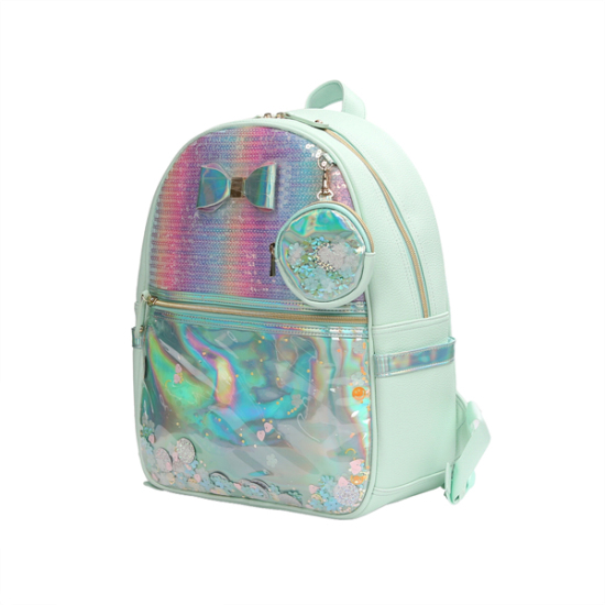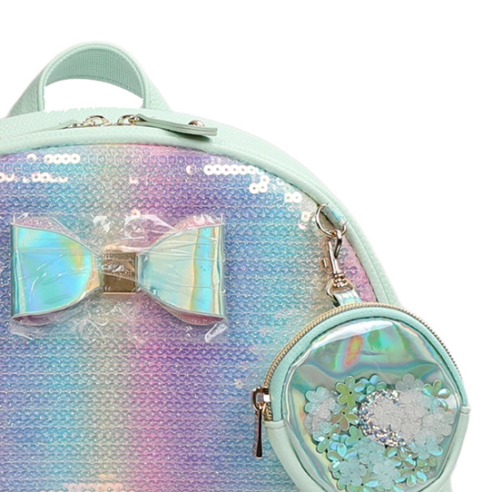 상세설명-전체적으로 민트 바디에 산뜻한 펄 그라데이션 소재 위에 스팽글 자수 작업을 하여 좀 더 반짝이는 효과를 준 책가방입니다.