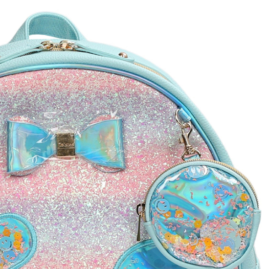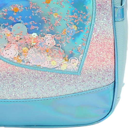 상세설명-블루 칼라 바디와 은은한 톤의 펄 그라데이션 소재를 앞면에 사용하고 그 위에 큰 홀로그램 하트 장식안에 반짝이는 스팽글 장식을 넣어 화려함을 살린 책가방입니다.