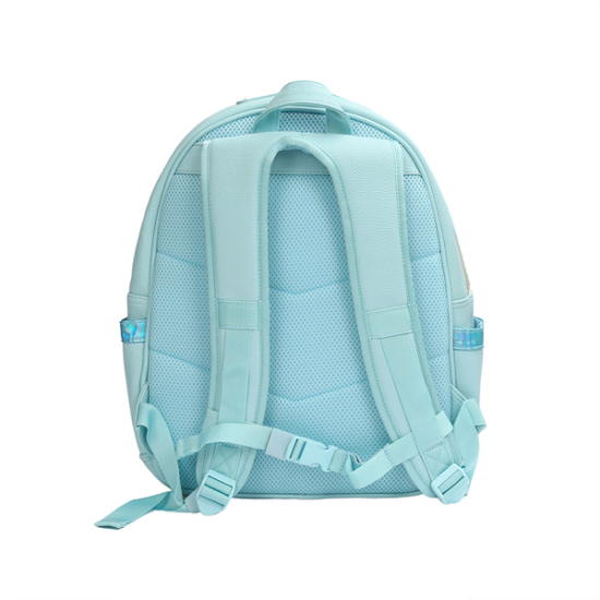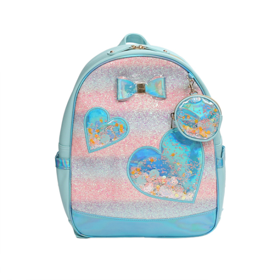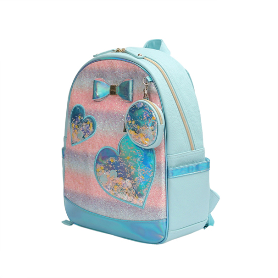 상세설명-블루 칼라 바디와 은은한 톤의 펄 그라데이션 소재를 앞면에 사용하고 그 위에 큰 홀로그램 하트 장식안에 반짝이는 스팽글 장식을 넣어 화려함을 살린 책가방입니다.