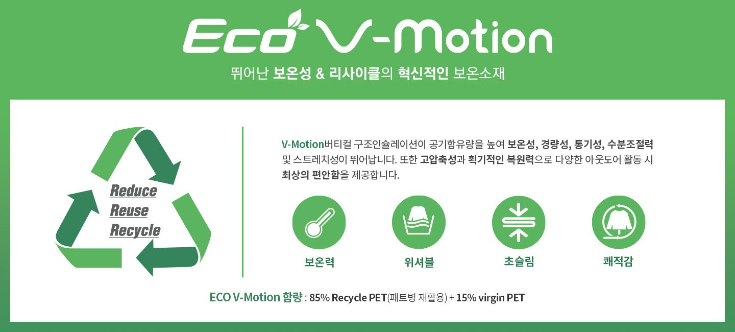 리사이클 보온소재(ECO V MOTION)를 적용해 보온성이 좋은 제품입니다.