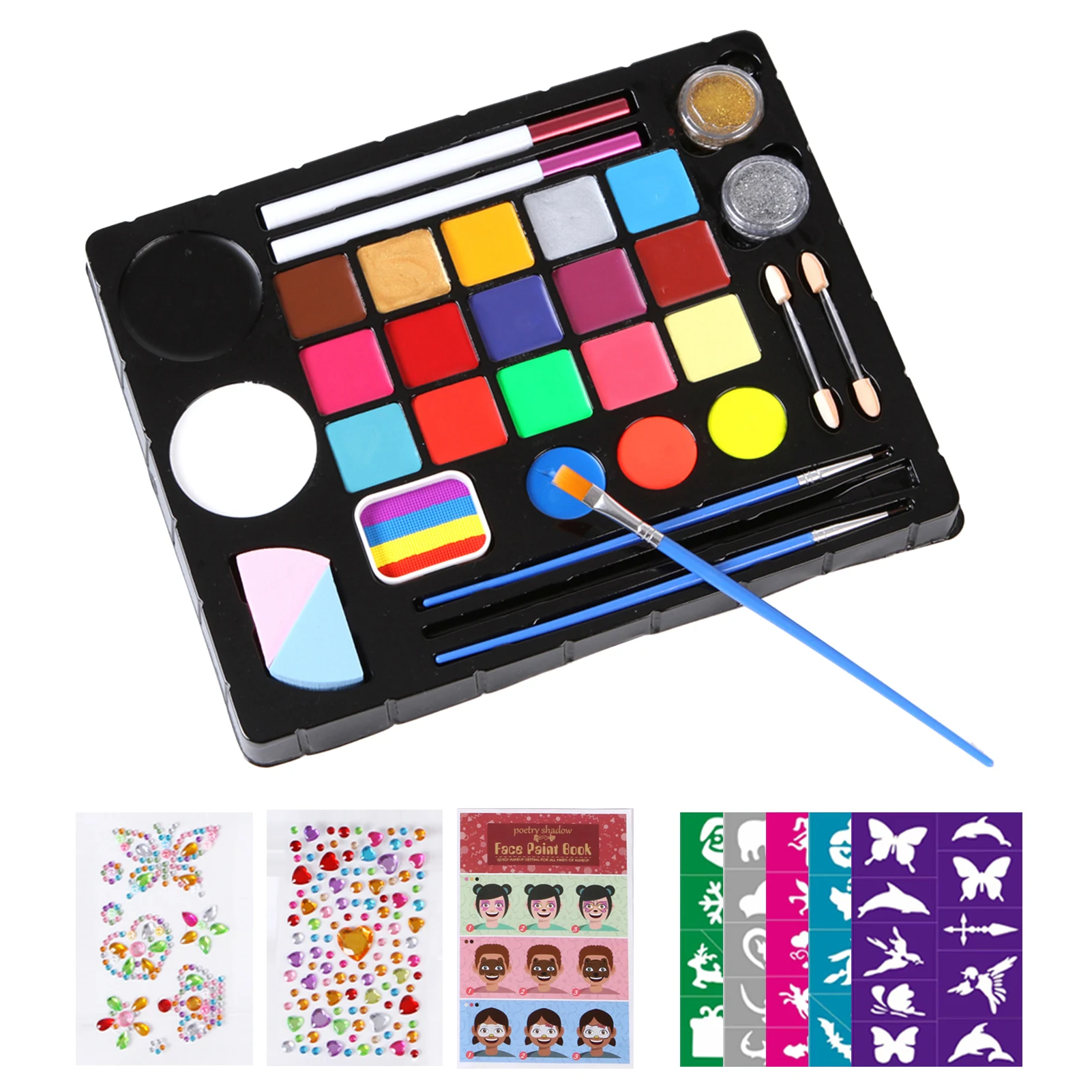 20 수채화 페인트 세트: 이 페이스 페인팅 키트를 사용하면 전문가처럼 얼굴을 칠할 수 있습니다. 이 페인트 키트에는 생생한 색상 20 개와 반짝이 2 개, 아이라이너 2 개, 플래시 드릴링 스티커 2 장, 스텐실 5 개, 페인트 브러시 3 개, 스폰지 2 개, 폼 브러시 2 개 및 사용 설명서가 제공됩니다.