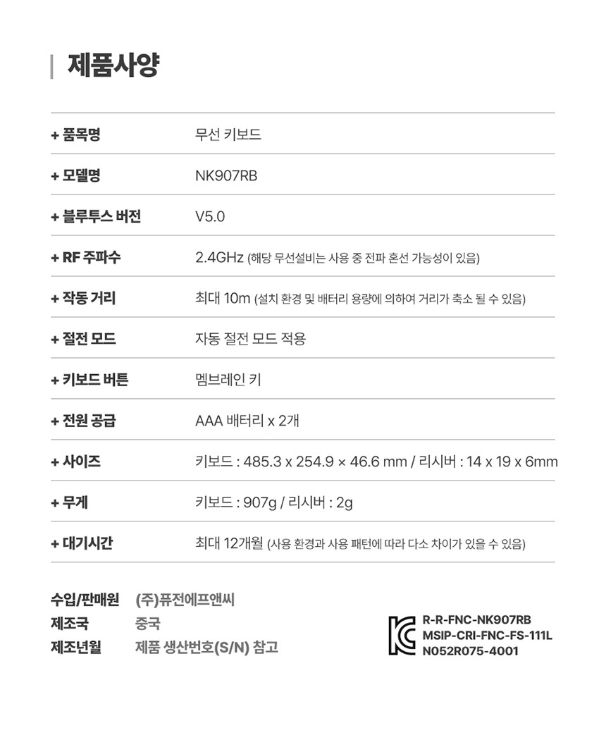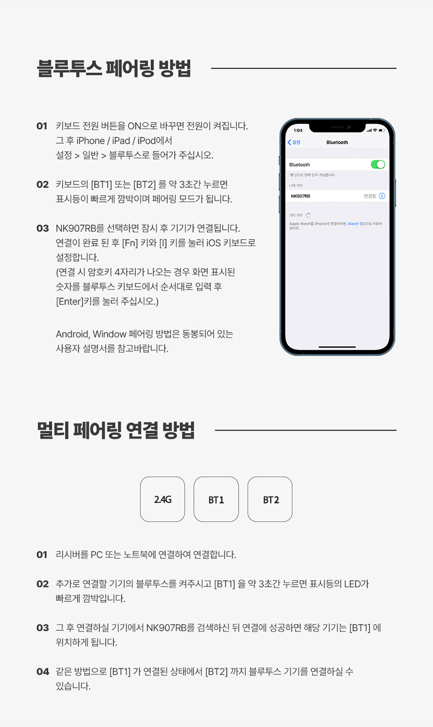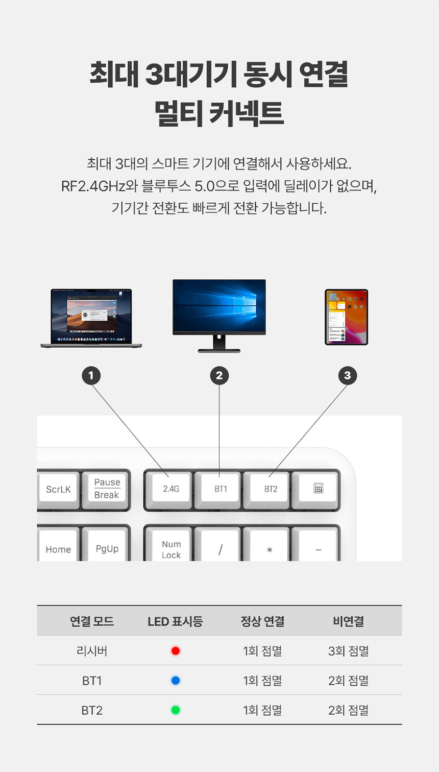 RF2.4Ghz 무선, 블루투스 연결 / 최대 3대 멀티페어링