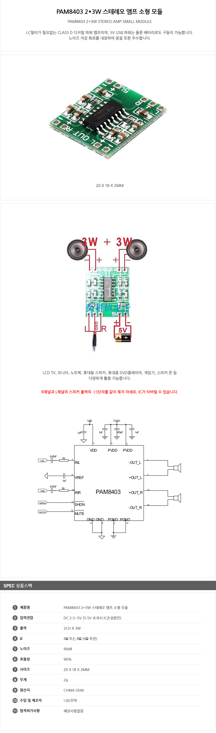 2채널 3W 스테레오 소형 앰프 모듈 스피커 PAM8403