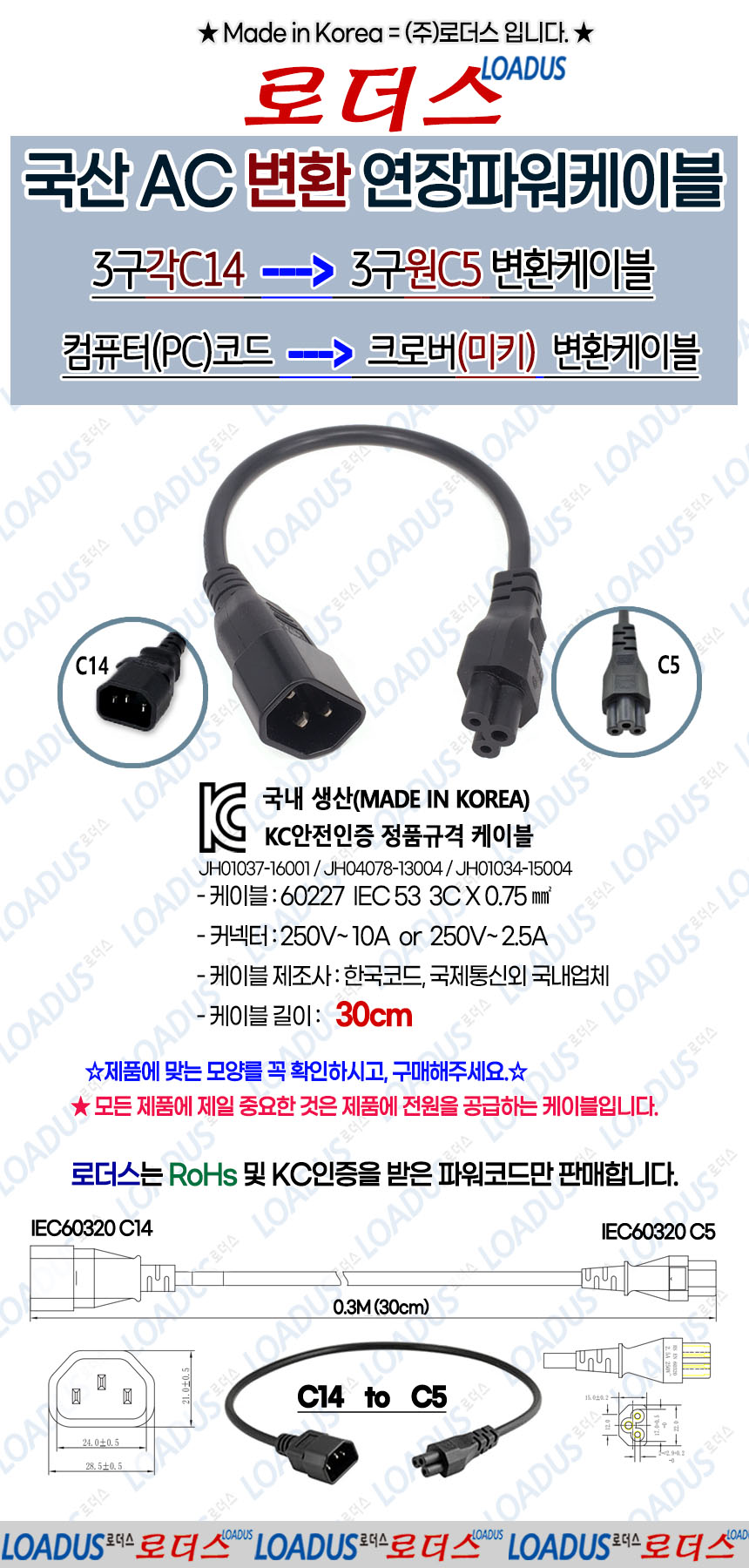 국산 PC전원 크로바코드로 변환캡코드C14 to C5 30cm 로더스 국산/보호회로/KC안전인증