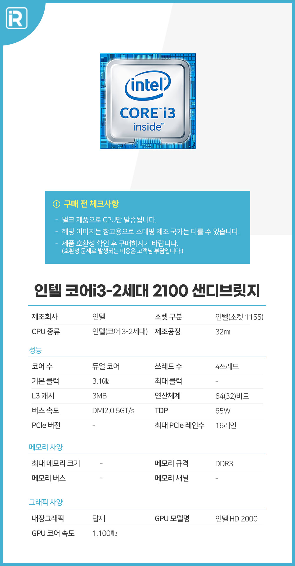 i3 2100 CPU 2세대 인텔 샌디브릿지 1155 소켓