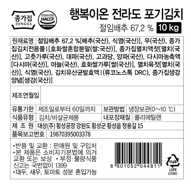 종가집 행복이온 전라도 포기김치 10kg