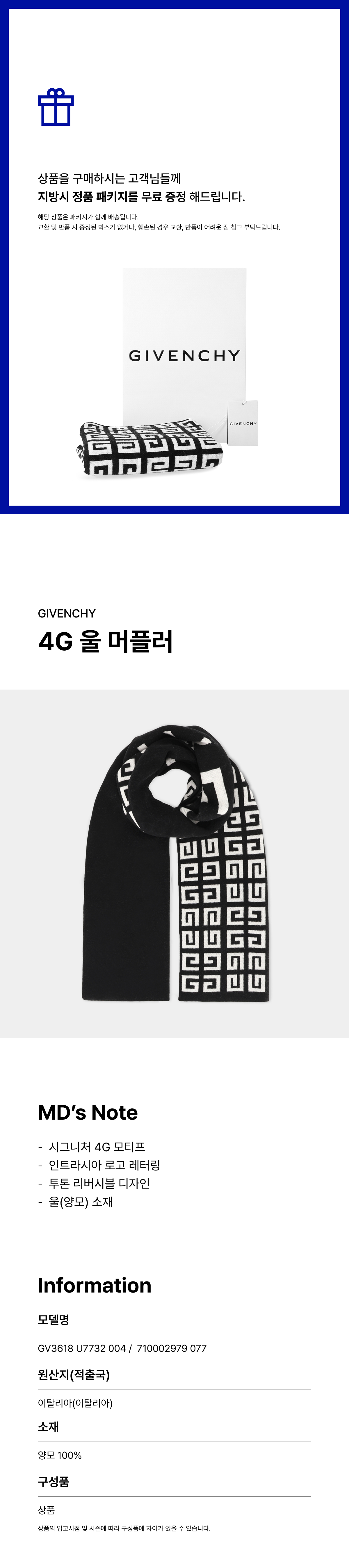 정상가 -81% 패키지증정 지방시 4G 울 머플러 GV3618 U7732 004