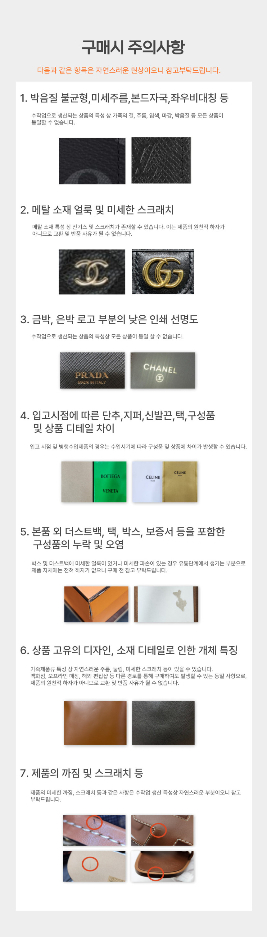 -제품마다(특히 가죽제품) 수작업으로 이뤄지는 제조공정상 패턴, 결, 주름의 차이, 눌림자국 등이 있을 수 있으며, 신발의 경우 하자로 보기 어려운 미세한 스크래치, 미세주름, 재봉 마감실 미정리, 접착제 자국 등이 있을 수 있으니, 예민하신 분들은 직접 백화점 구매를 추천드립니다