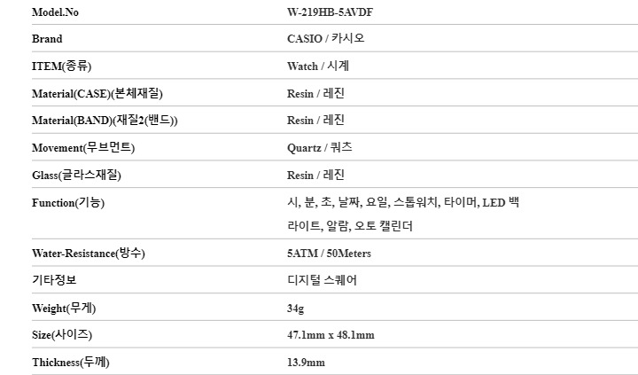 카시오 CASIO W-219HB-5AVDF 남성 우레탄시계