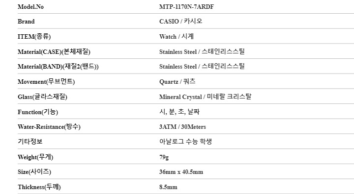 카시오 CASIO MTP-1170N-7ARDF 공용 메탈시계
