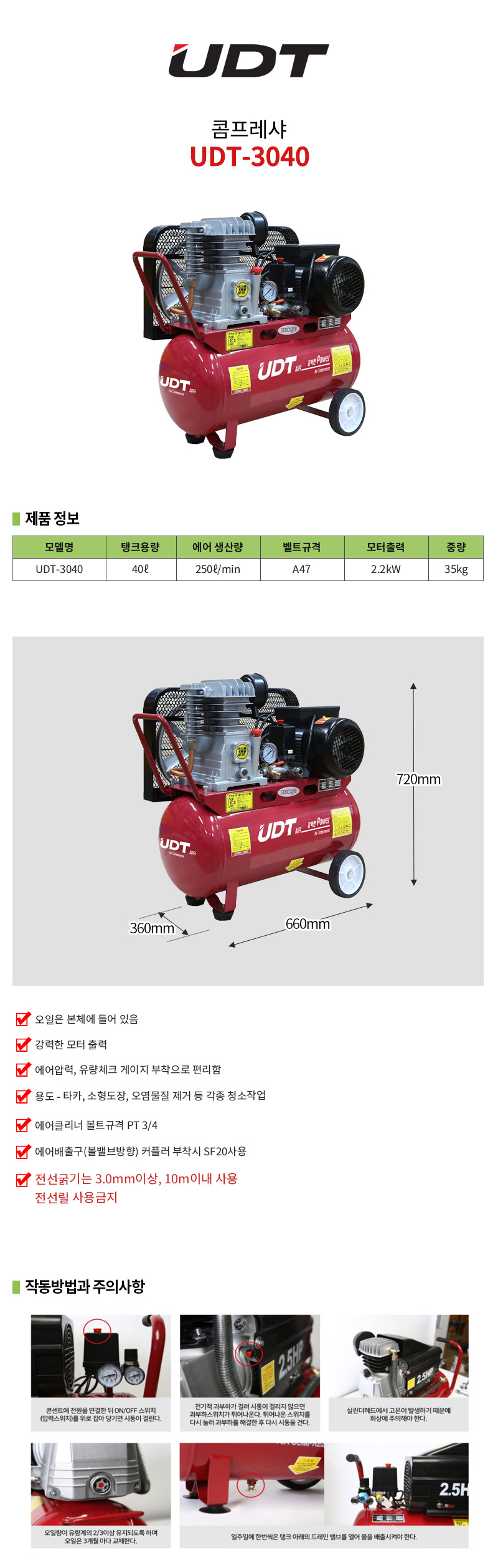 UDT 콤프레샤 UDT-3040 3마력 40리터 컴프레샤 벨트타입 오일타입 에어공구