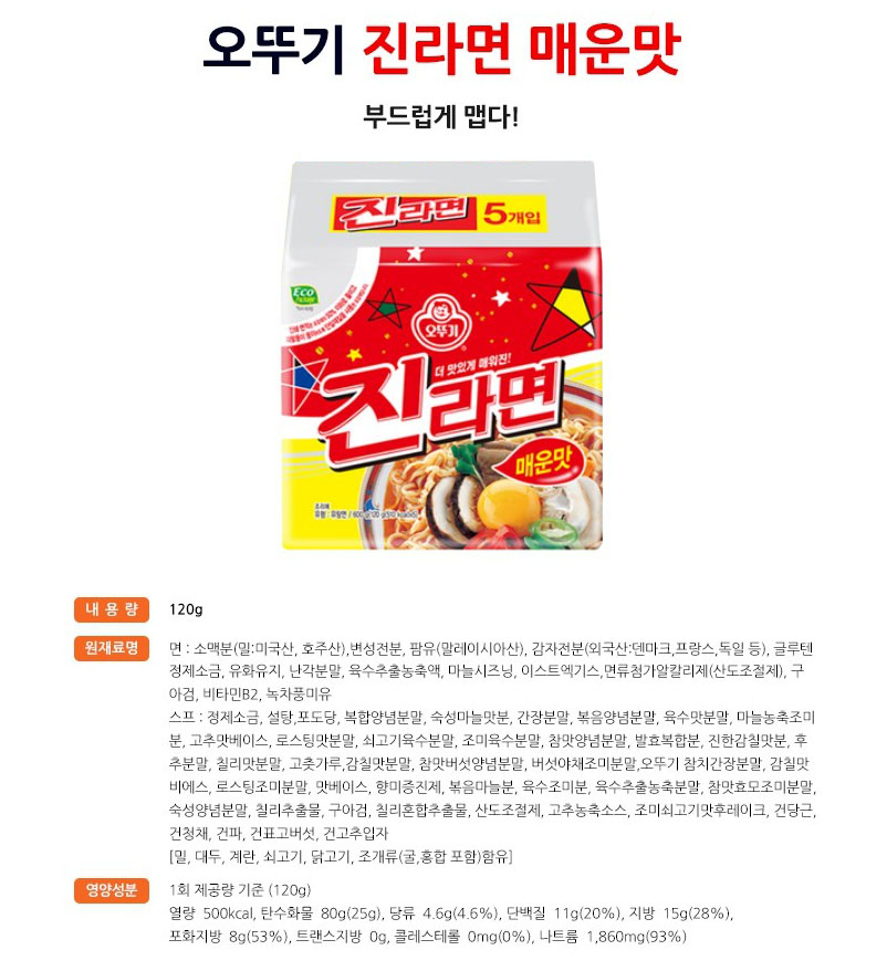 진라면 매운맛 오뚜기 진라면 멀티팩 매운맛 120g 40개