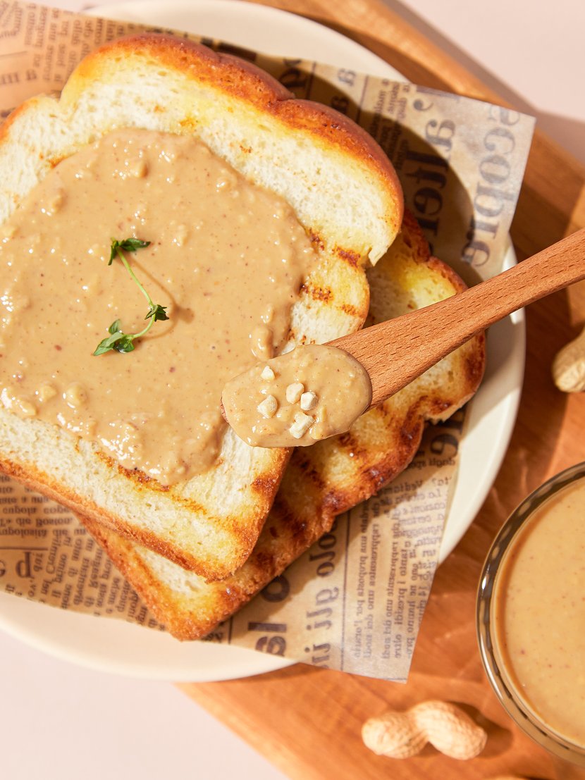 옳곡 땅콩버터는 100% 국내산 땅콩만 갈아 넣은 무첨가 땅콩버터예요. 땅콩 알갱이가 살아있어 더욱 꾸덕하고 고소하게 씹히는 맛이 좋은 크런치 타입으로 식감과 풍미를 동시에 즐길 수 있는 제품이랍니다. 다른 땅콩은 1%도 넣지 않고 국내산 상급 알땅콩만을 사용한 무첨가 제품이라 온 가족이 안심하고 먹을 수 있죠. 부드러운 발림성과 오독오독 씹히는 땅콩이 매력적인 옳곡 땅콩버터 크런치를 토스트에 슥슥 발라 즐기거나, 고소함이 필요한 요리에 사용해 보세요.