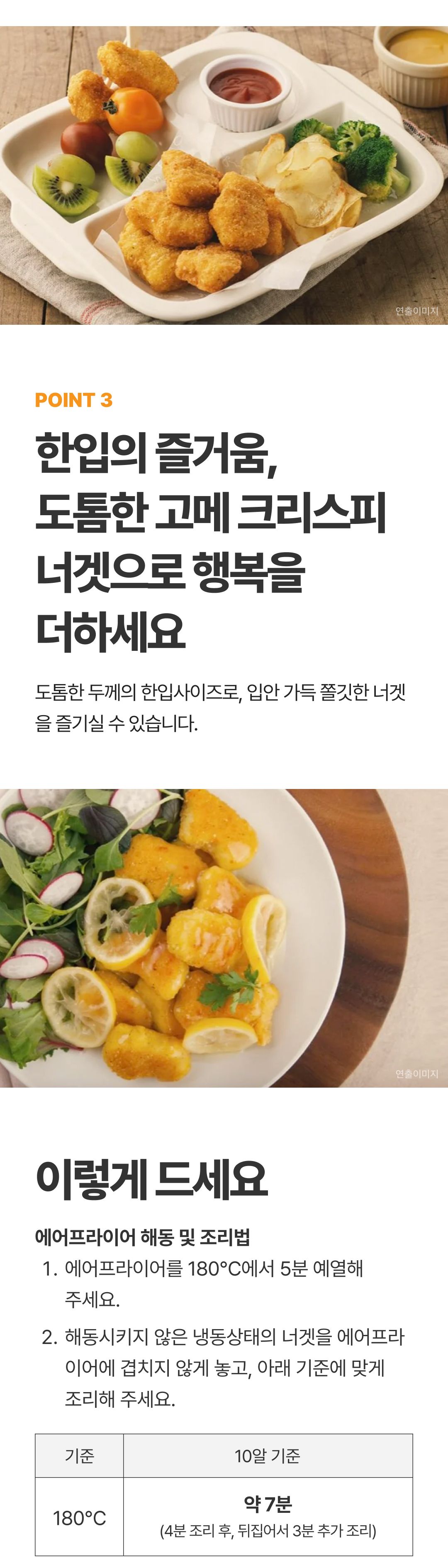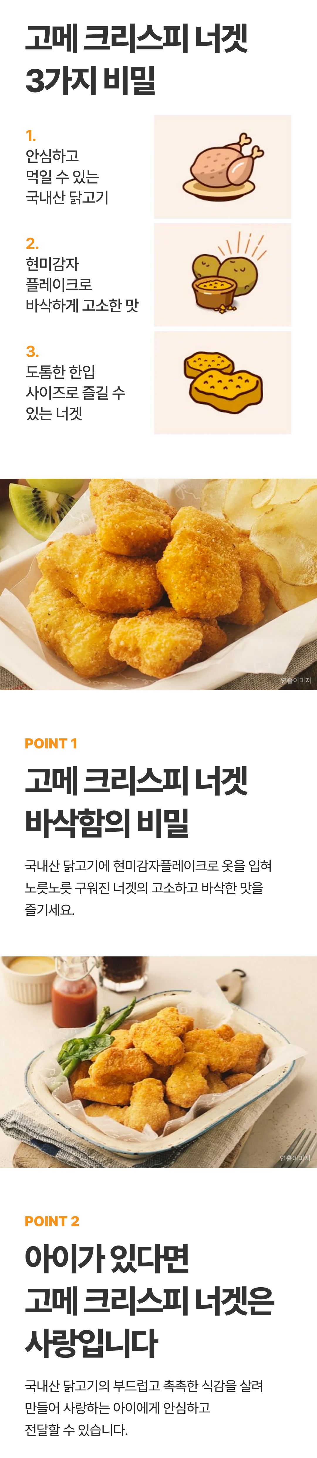 | 원재료명 및 함량 | 닭고기(국산) 55.4%, 정제수, 현미감자플레이크-1[빵가루{밀가루(밀:미국, 호주산)}, 밀가루(밀:미국, 호주산), 곡류가공품,건조감자분말, 현미볶음분태], 곡류가공품1{밀가루(밀:미국, 호주산), 소맥전분(외국산)}, 곡류가공품2, 콩기름, 기타가공품, 분리대두단백, 마늘, 설탕, 정제소금, 복합조미식품, 소스, 혼합제제(폴리 인산나트륨, 피로인산나트륨, 메타인산나트륨), 향미증진제, 후춧가루 *주표시면(전면) 원료 함량: 닭고기 55.4 %, 현미감자플레이크-1 13.9 % |