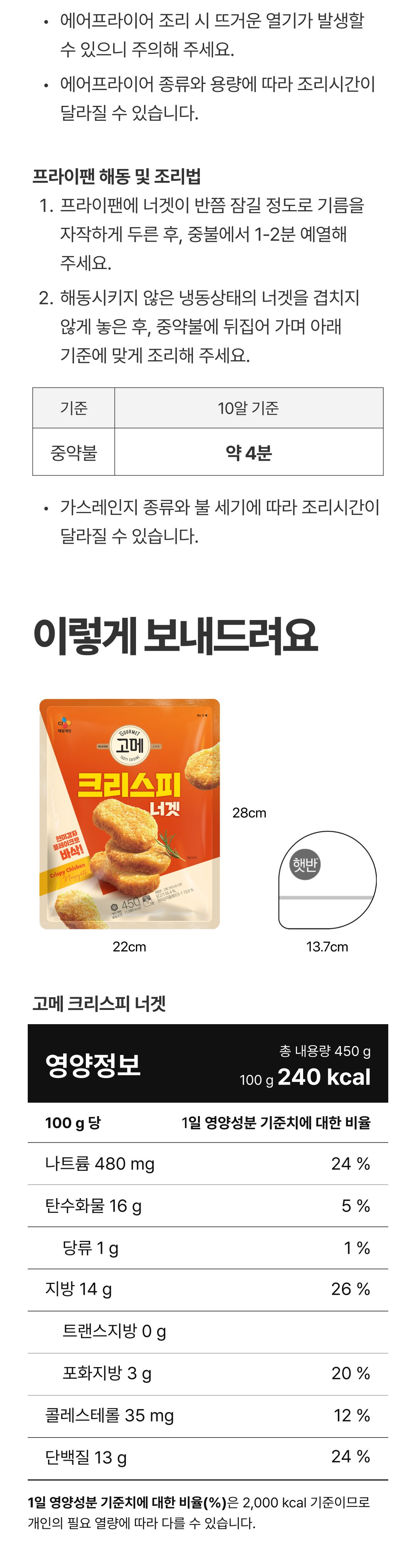 | 영양성분 | 총대용량 450g (1,080 kcal) / 나트륨 480 mg 24%, 탄수화물 16g 5%, 당류 1g 1%, 지방 14g 26%, 트랜스지방 0g, 포화지방 3g 20%, 콜레스테롤 35mg 12%, 단백질 13g 24% |