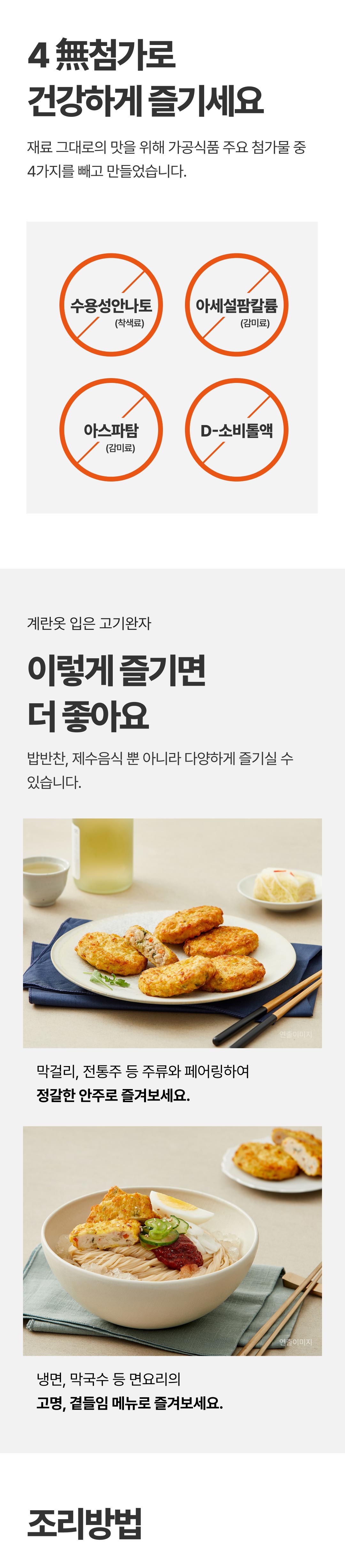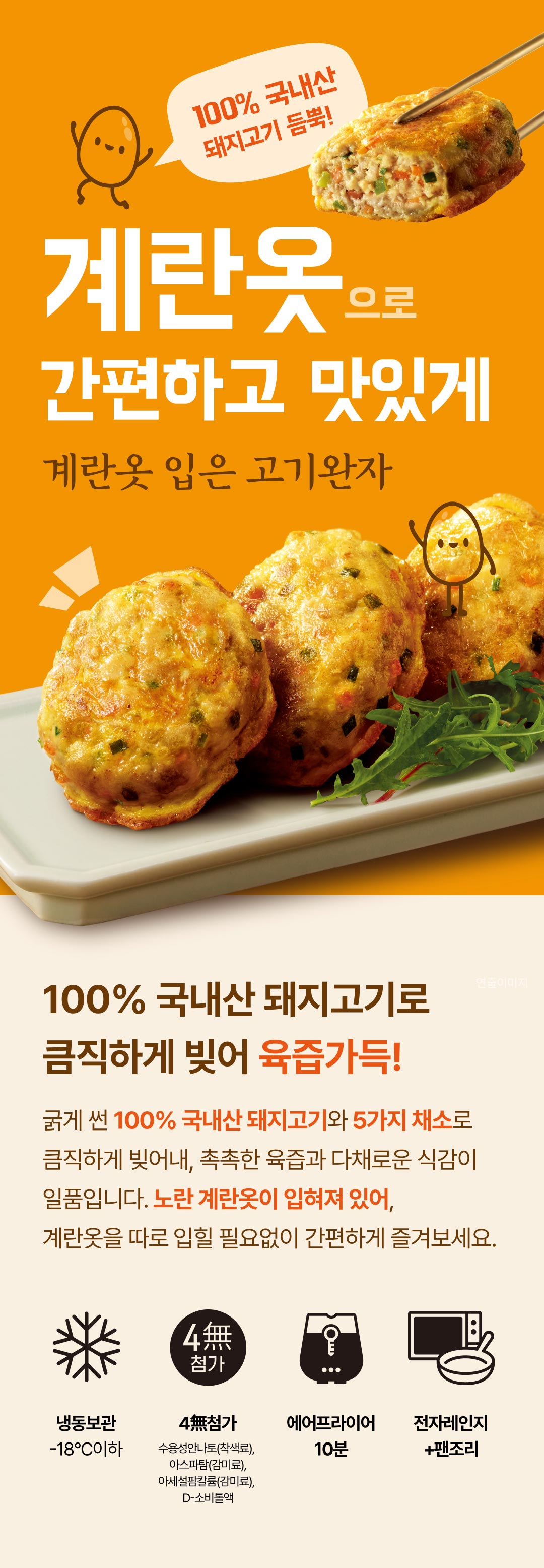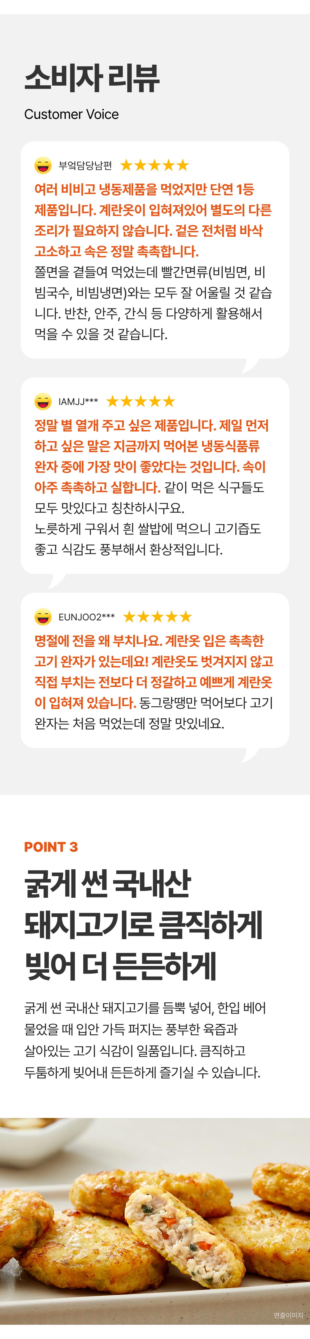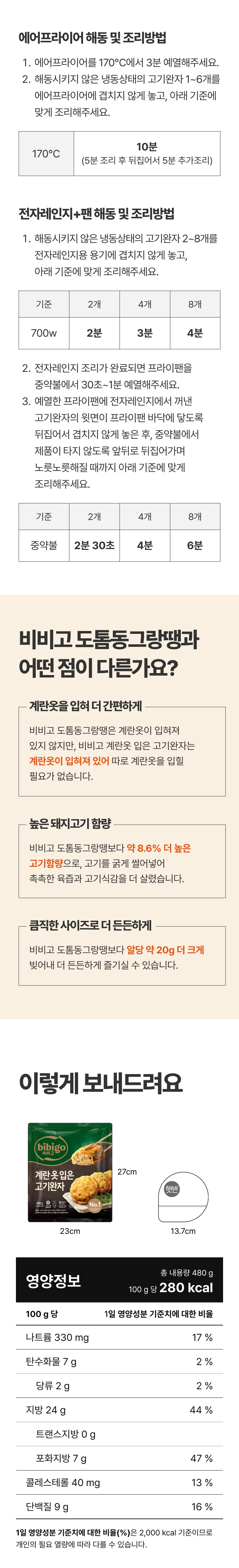 | 소비자안전을 위한 주의사항 | •부정 · 불량식품 신고는 국번없이 1399 •이 제품은 우유,메밀,땅콩,고등어,게,새우,닭고기,복숭아,토마토,아황산류,호두,오징어,조개류(굴,전복,홍합 포함),잣을 사용한 제품과 같은 제조 시설에서 제조하고 있습니다. •양파를 사용하여 양파의 얇은 막이 있을 수 있습니다. •제품 표면에 대파/부추로 인하여 계란옷 색이 어두울 수 있으나 탄화물이 아니니 안심하시기 바랍니다. •필요한 양만큼 꺼내어 사용하신 후 남은 제품은 냉동실에 바로 보관하십시오. •보관 방법 미준수 시에는 변질 등의 우려가 있으니 반드시 보관조건을 지켜주시기 바랍니다. •본 제품은 소비자 분쟁해결기준에 의거, 교환 또는 보상받을 수 있습니다. •이미 냉동된 바 있으니 해동 후 재냉동시키지 마시길 바랍니다. •사용 후 포장지는 반드시 분리배출하여 주십시오.•제품 표면에 육즙이 묻어있거나 배어나올 수 있으나, 정상적으로 열처리 진행된 제품이오니 안심하고 드셔도 됩니다. 조리 시 주의사항 •팬 조리 시 제품을 뒤집을 때 기름이 튀어 화상을 입을 수 있으니 주의하십시오. •전자레인지 조리 후 용기가 뜨거울 수 있으니 주의하시기 바랍니다. •조리 후 내용물 및 용기가 뜨거우므로 화상에 주의하십시오.•조리시 조리기구가 과열 될 수 있으니 꼭 자리를 지켜 조리 과정을 확인하십시오.•조리 후 제품이 뜨거울 수 있으니 드실 때 조심하시기 바랍니다.•조리도구(에어프라이어, 전자레인지, 가스레인지)의 종류와 출력에 따라 조리시간이 달라질 수 있습니다. •조리 후 제품이 차가울 경우 1~2분간 추가로 조리해주세요.•과도한 양을 조리 시 품질 저하가 있을 수 있으니 주의하십시오. |