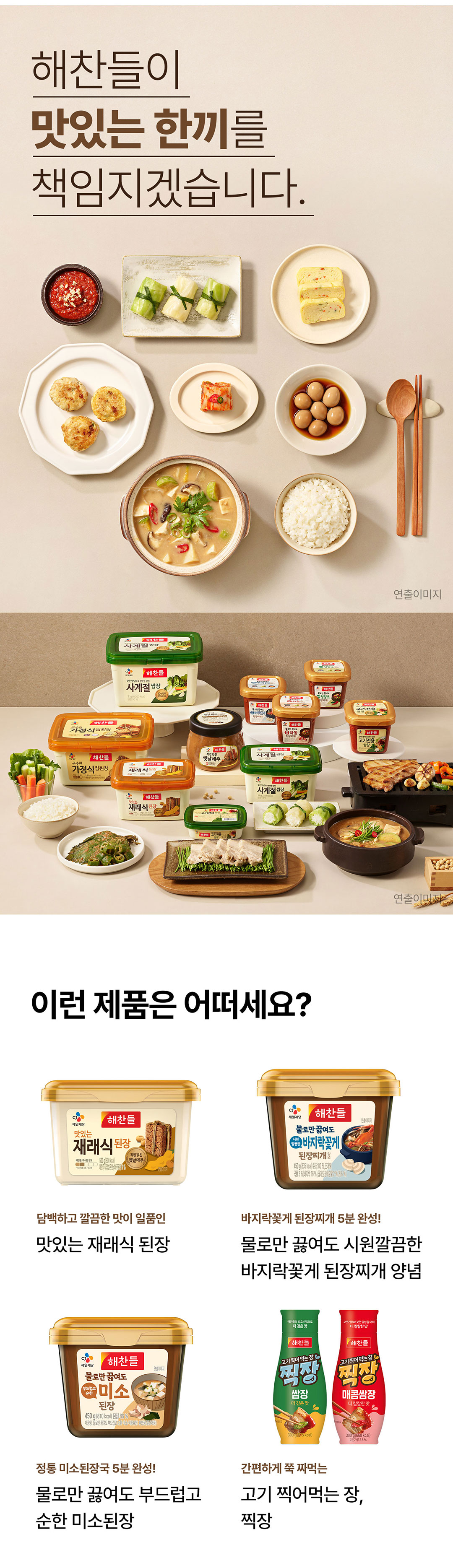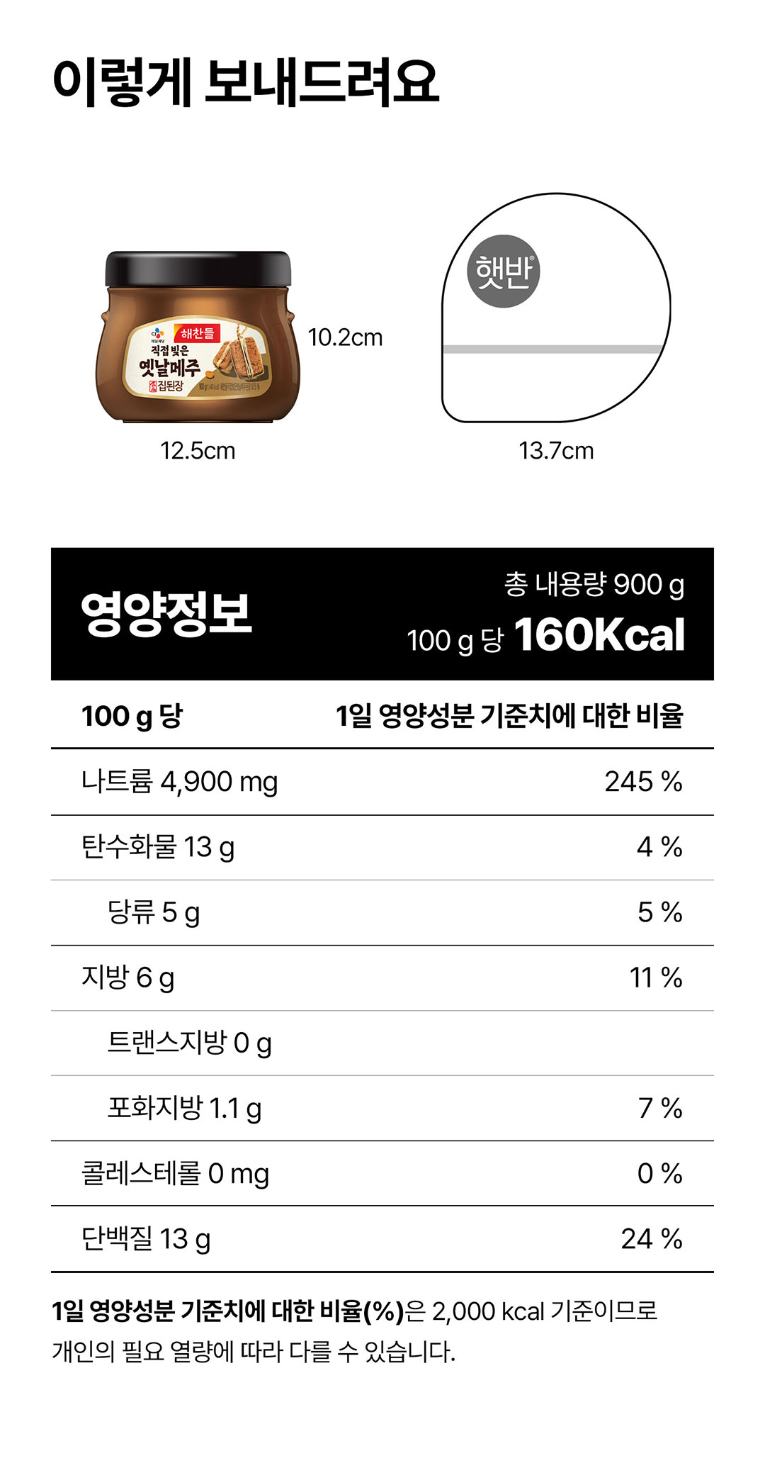 | 원재료명 및 함량 | 해찬들직접빚은옛날메주된장 97.5 %{대두(외국산),정제소금 (국산)},주정,대두분{대두(외국산)}*주표시면(전면) 원료 함량: 해찬들직접빚은옛날메주된장 97.5% |