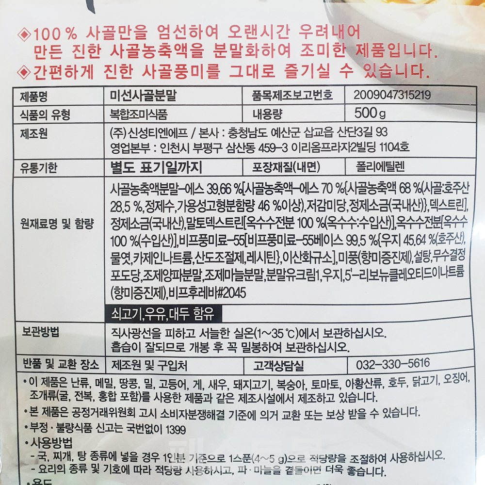 국, 찌개, 탕종류에 넣을 경우 1인분 기준으로 1스푼(4~5g)으로 적당량을 조절하여 사용하십시오.