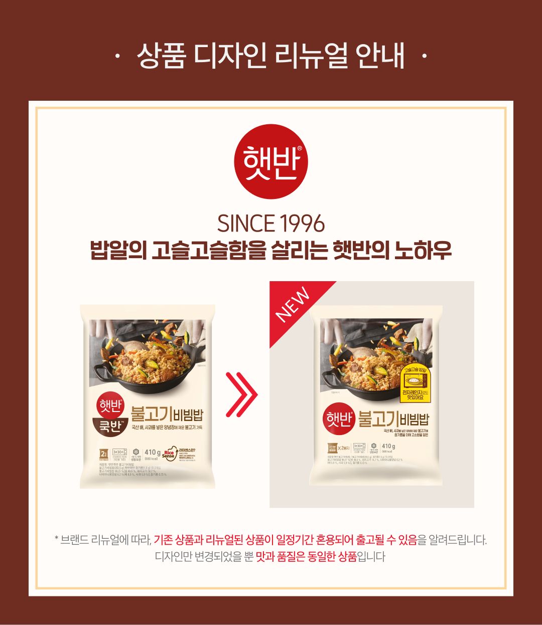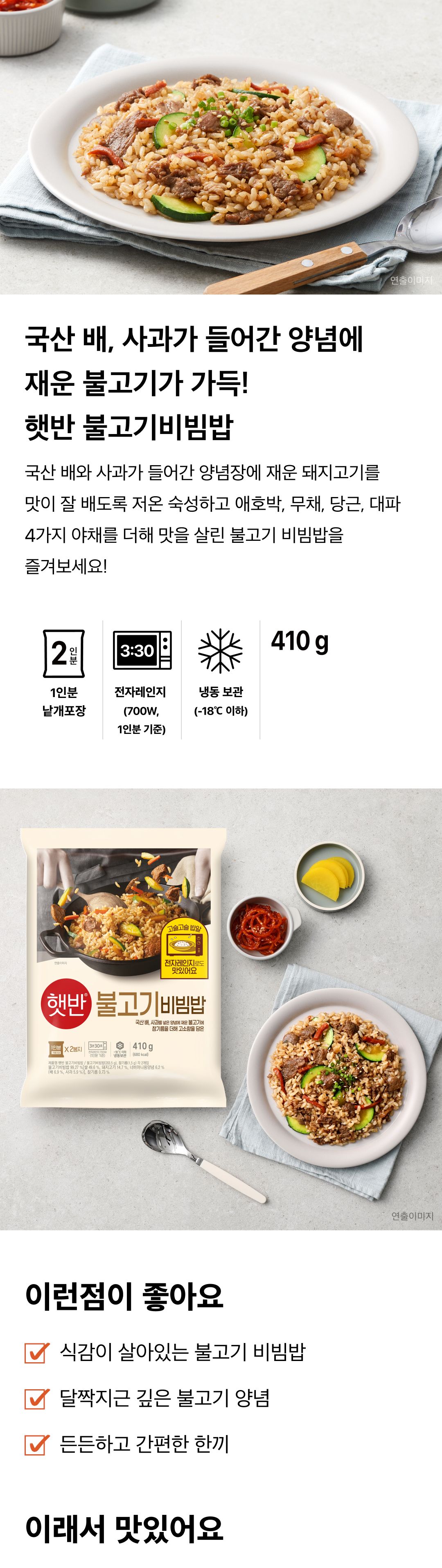 *주표시면(전면) 원료 함량: 불고기비빔밥 99.27 %[쌀 49.6 %, 돼지고기 14.7 %, 너비아니용양념 6.2 %(배 6.5 %, 사과 5.5 %)], 참기름 0.73 % |