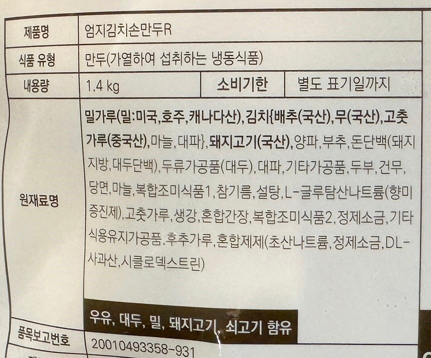 엄지 김치손만두 1400g x 1개 냉동식품 매콤한 전골 간편식품 주식회사 식판사