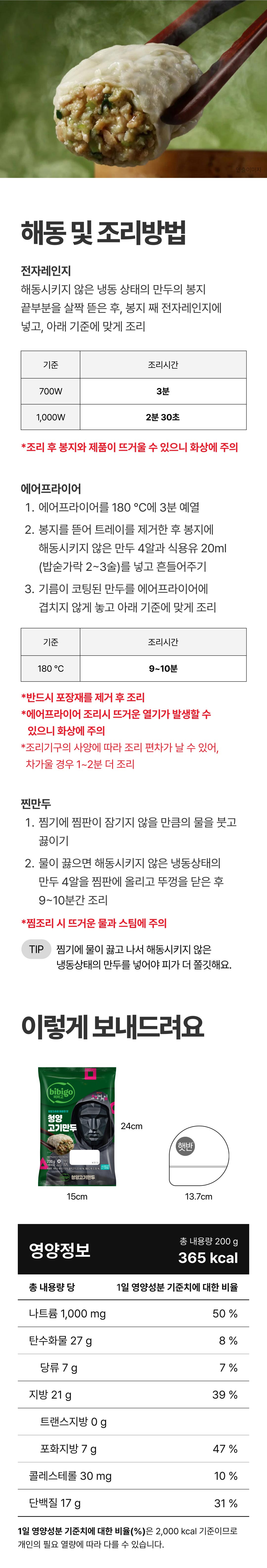 소비자안전을 위한 주의사항  부정·불량식품 신고는 국번없이 1399  알류, 우유, 메밀, 땅콩, 고등어, 게, 새우, 닭고기, 쇠고기, 복숭아, 토마토, 아황산류, 호두, 오징어, 조개류(굴, 전복, 홍합 포함), 잣 혼입 가능 이미 냉동된 바 있으니 해동 후 다시 냉동하지 마시고, 보관조건을 지켜주시기 바랍니다. 사용 후 포장지는 반드시 분리배출 본 제품은 소비자 분쟁해결 기준에 의거, 교환 또는 보상받을 수 있음.[조리 시 주의사항] 반드시 조리하여 익힌 후 드세요. 만두의 육즙이 뜨거울 수 있으니 드실 때 주의하세요 청양고추가 함유되어매울 수 있어요. 조리 시 조리기구가 과열 될 수 있으니 꼭 자리를 지켜 조리과정을 확인하세요 양파, 대파를 사용하여 해당 원료의 얇은 막이 있을 수 있어요. 만두 피와 속의 까만 점처럼 보이는 부분은 후춧가루이오니 안심하고 드세요. 필요한 양만큼 꺼내어 사용하신 후 남은 제품은 냉동실에 바로 보관하세요.