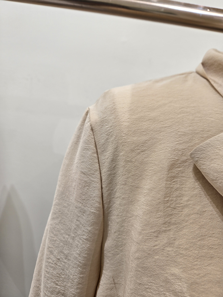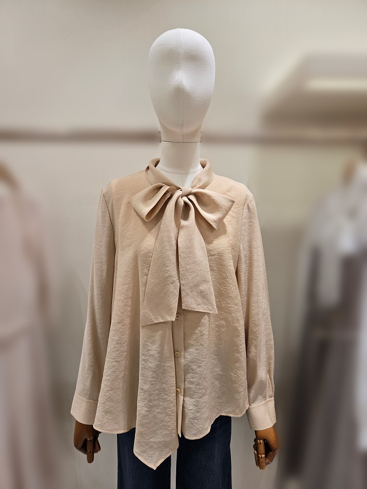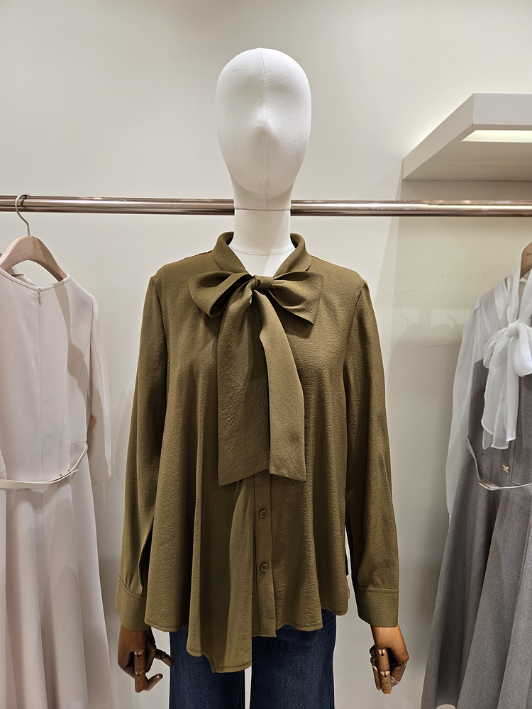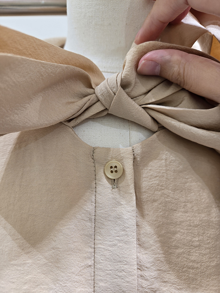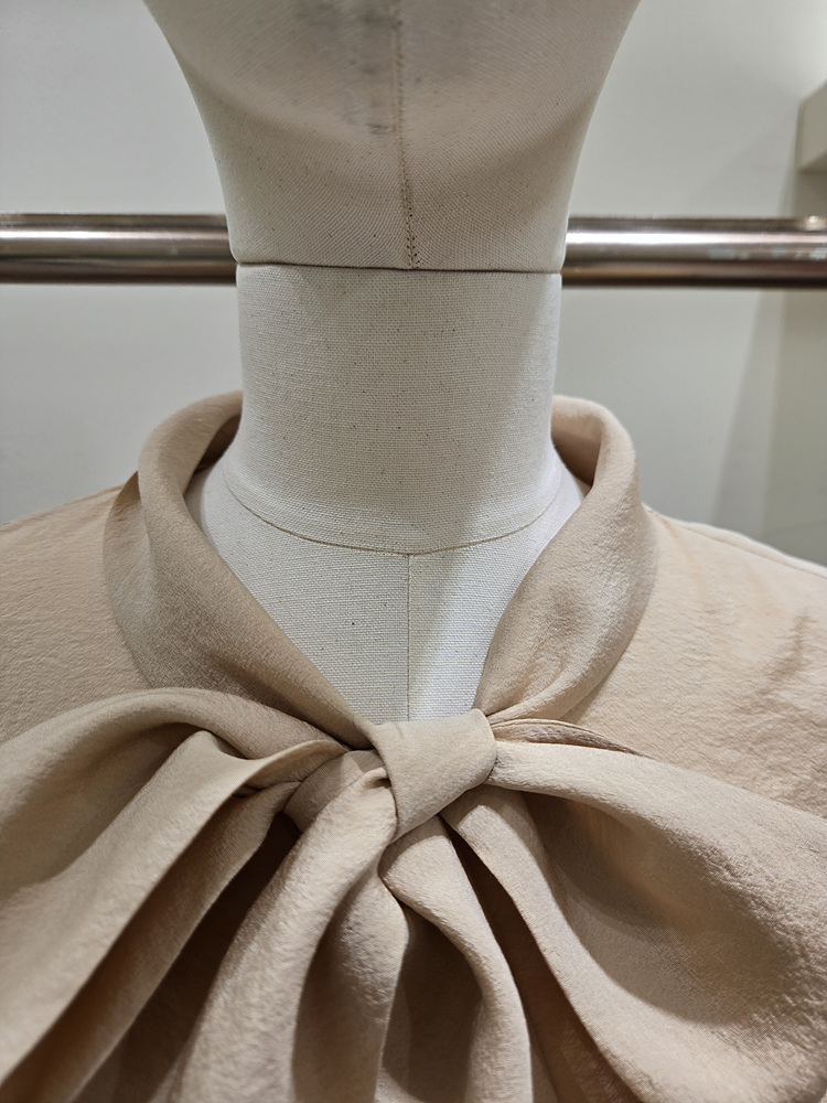 리본 타이넥이 포인트이며, 프론트의 언밸런스한 실루엣이 매력적입니다.