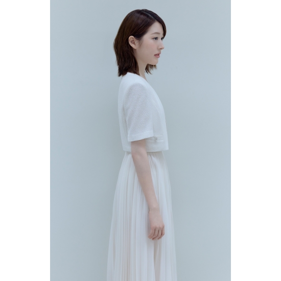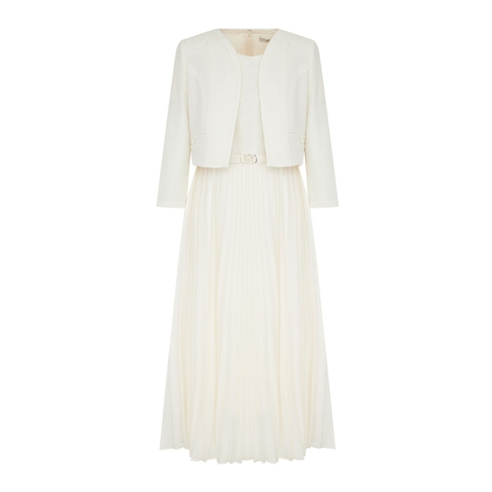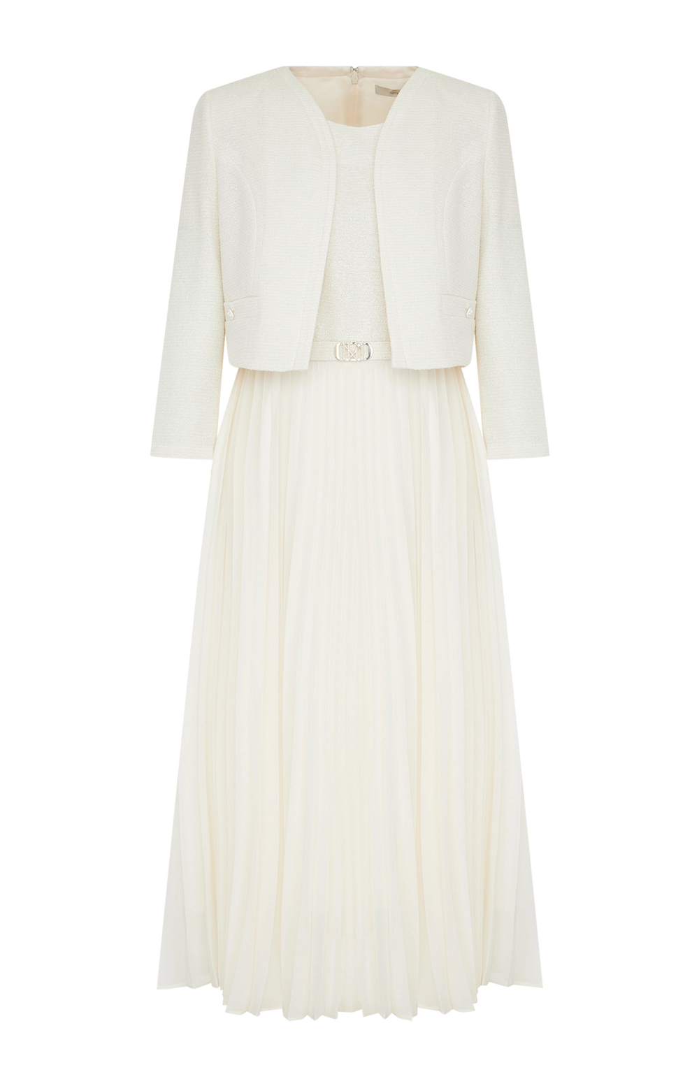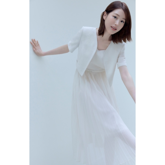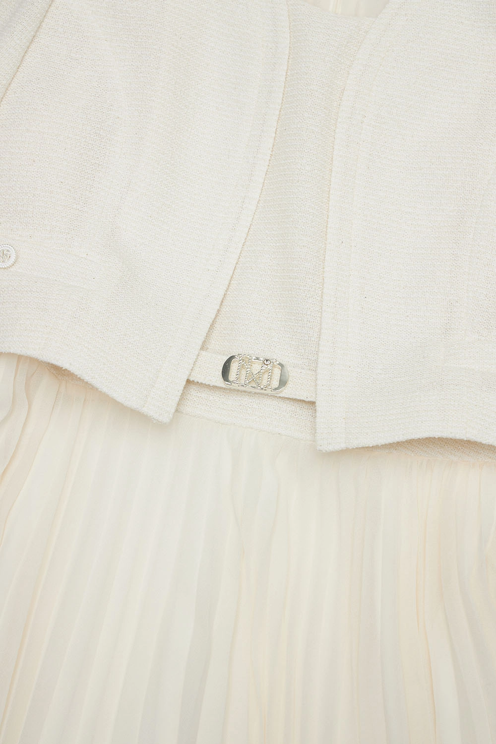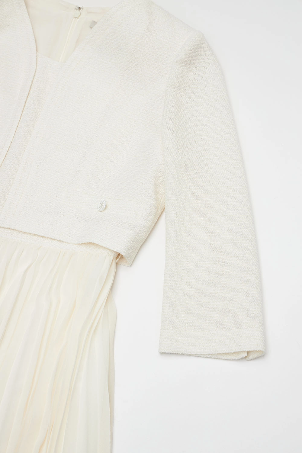 플리츠 원피스와 자켓을 레이어드하여 착용한 듯한 디자인이 매력적인 원피스입니다.