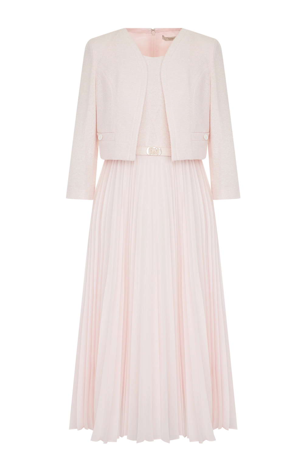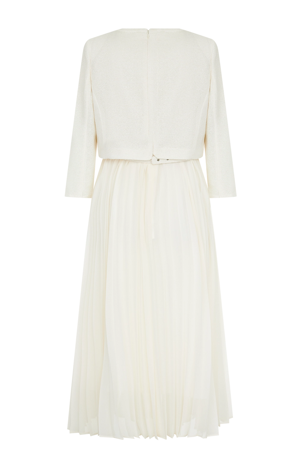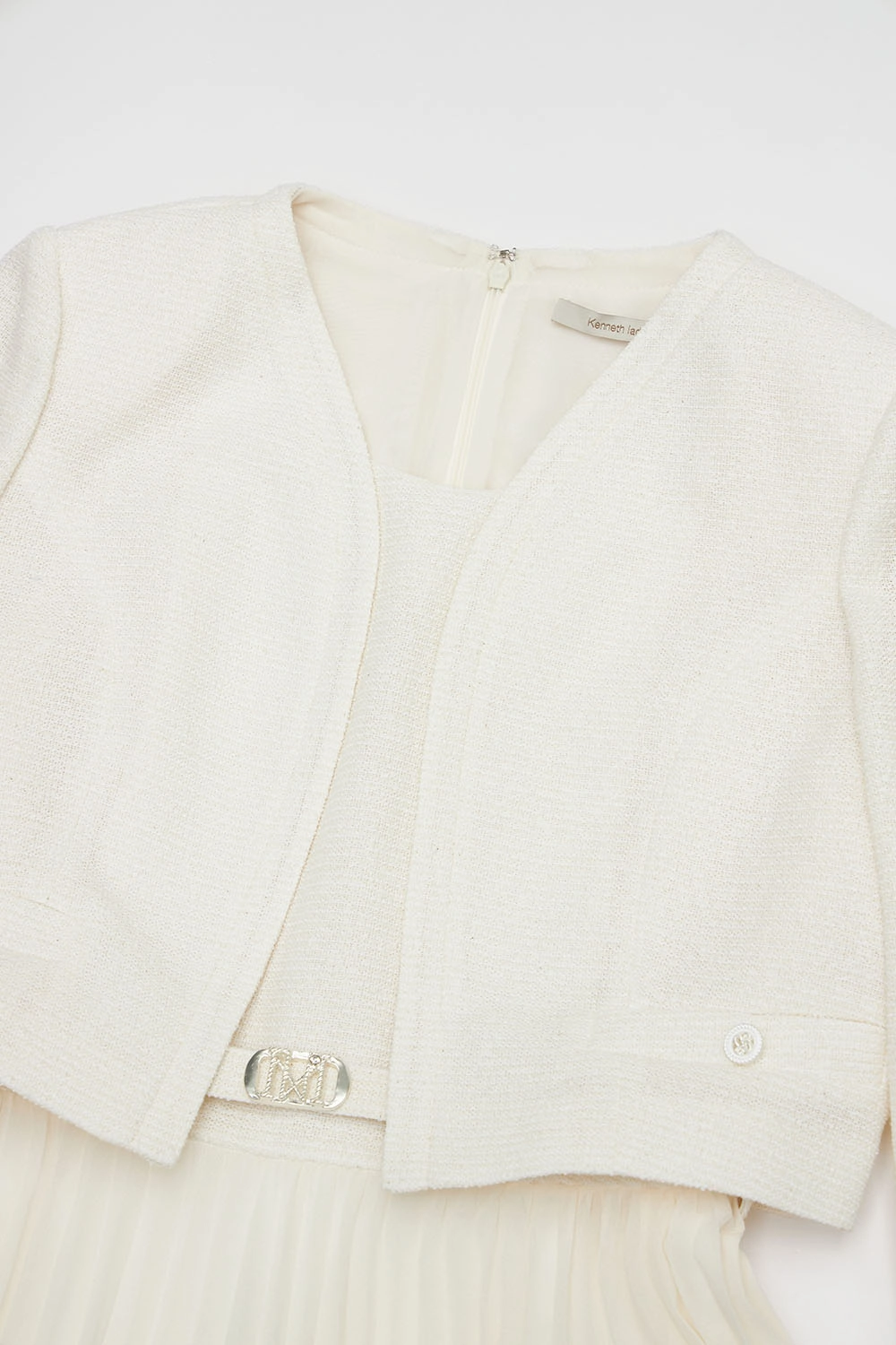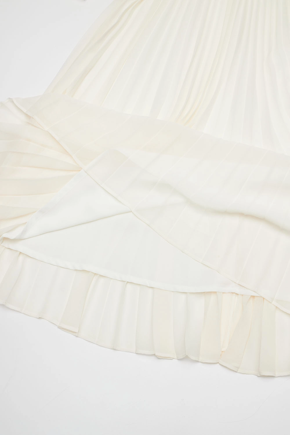 플리츠 원피스와 자켓을 레이어드하여 착용한 듯한 디자인이 매력적인 원피스입니다.
