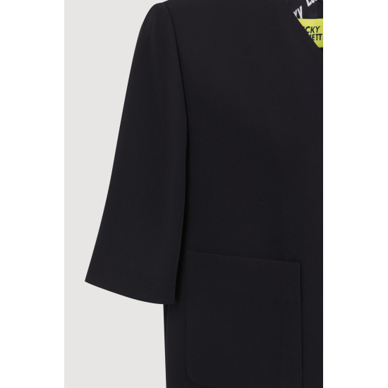 - 엠블럼 단추로 포인트를 줌. 어깨 패드로 핏과 실루엣을 살림.